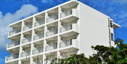 眼下に広がる水平線、静寂なマリンブルーの海に佇むリゾート